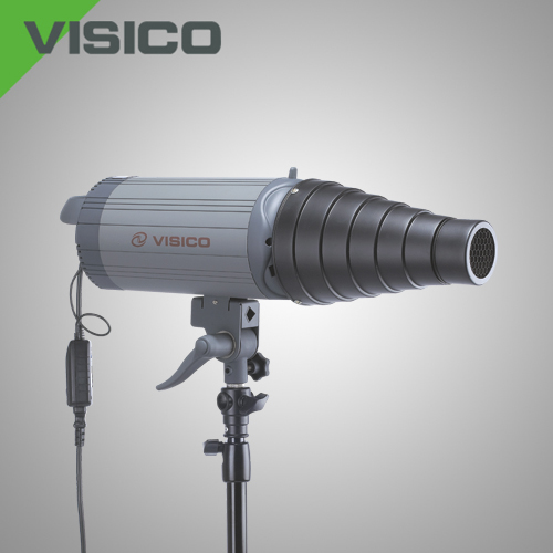 1. build in over heat protection, under same environment temperature, the studio flash can flash more 500 times than traditional studio flash, operational use time is longer 30 minutes. When studio flash is temperature alarm, it will increase recycle time to reduce heat. satisfied photographer's uninterrupted shoot demand at critical moment. 2. build in over voltage protection, prevent capacitor from explosion, explosive sound and smog, let photographer take photo smoothly. Studio flash has disturbance display, can clearly let photographer understand what is the problem, so easy to repair. 3. build in 2.4Ghz radio receiver, can match with portable VISICO VC-801TX multifunctional remote control ( perfectly combine remote and trigger into one). it is very easy to operate, through the combination of group and channel, can free control among each studio. The remote control can adjust flash power and switch on/off modeling lamp. (for example one studio has 4 light, can sparately control 64 pcs studio flash maximumly, and control among 16 studios. Suitable for the big scene). 4. the soft-start function of modeling lamp can protect photographers and customers' eyes, avoid momentary hard light. Increase the working life more than 3 times. Reduce the cost of buy lamp many times. 5. modeling lamp can be controled from proportion mode, full gloss mode, automatic start and stop mode and off mode. Can let photographer one button operate in different environment, make photographer have more thinking space. 6. safety ground, conform to one of the European most authoritative electronic products safety certificates--VDE standard. 7. aluminium alloy housing, stealth design of embedded retaining screw, avoid housing surface occur rusty phenomenon after long time use. Housing surface is made of antistatic environmental protection rubber paint, to protect photograper's fingers, improve image of studio. 8. stable internal performance, CPU control LED display, simply operation, easily use, the best choice of commercial and advertising photography. Provide the most professional and reliable lighting system for studios. 9. two kinds of recycling reminder: The photographer who like quiet environment can choose modeling lamp reminder. Who like sound can choose beep reminder. 10. 1 second recycle time at full power, long time continuous shooting, for fast grab shots and capture splendid moment. 11. Stepless power-control range of five f-stops from full to 1/32(6 stop points). Precision light-output adjustments to an accuracy of 1/10 f-stop, output accuracy is 1%. Keep stable color temperature when power change. 12. Delay flash/redeye reduction function, 7 pre flashes at max.. Can match with different camera flash and speedlite. Meet professional photographer's creation demand, let them creat with high proficiency. 13. In order to build rich light and shadow effect, need to use professional big size accessories,such as beauty dish and grid softbox. The holder can move up and back, play the role of keeping balance of flash light center of gravity. 14. power cord is not easy to aging, safe and reliable.